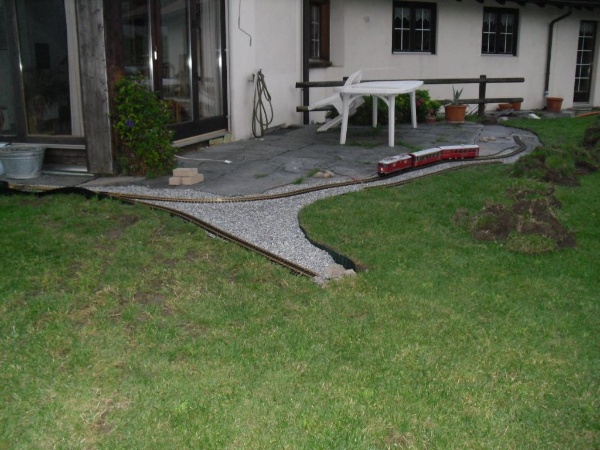 Nach den Grabarbeiten musste ich feststellen, dass die Trassehöhe so ziemlich am ungünstigsten Ort war, nämlich 15cm unter Terrain. Die Trassehöhe war durch die Anschlusspunkte jedoch gegeben. Da das absenken des Terrain praktisch nicht möglich war, entschied ich mich wohl oder übel für einen Tunnel.