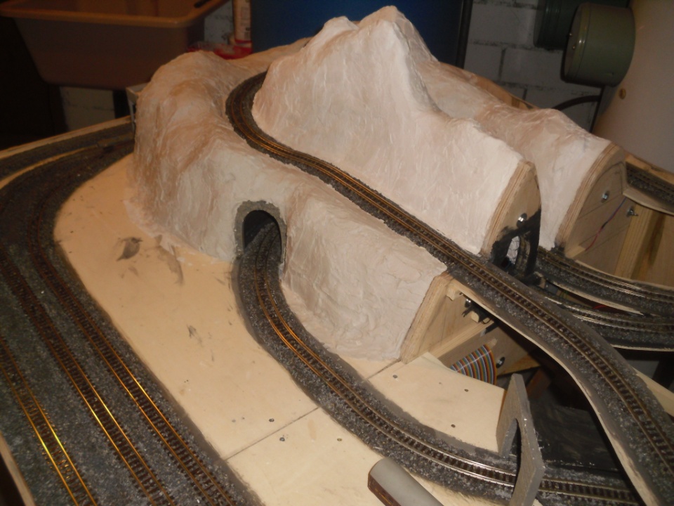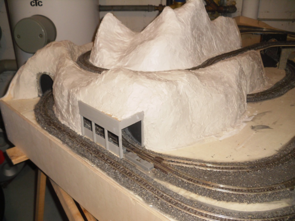 Nachdem der Gips gut durchgetrocknet ist, wird mit der Nachbearbeitung der Felskonturen, Tunnelportale, Trasseübergänge etc. begonnen. Dies geschieht einerseits durch Abtragen von Gips mit Stechbeitel und Kutter und andererseits durch Auftragen von Spachtelmasse.