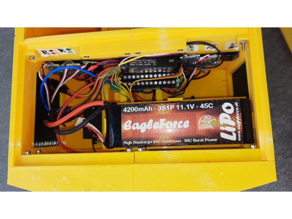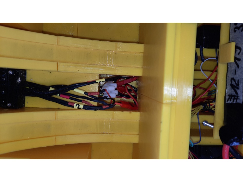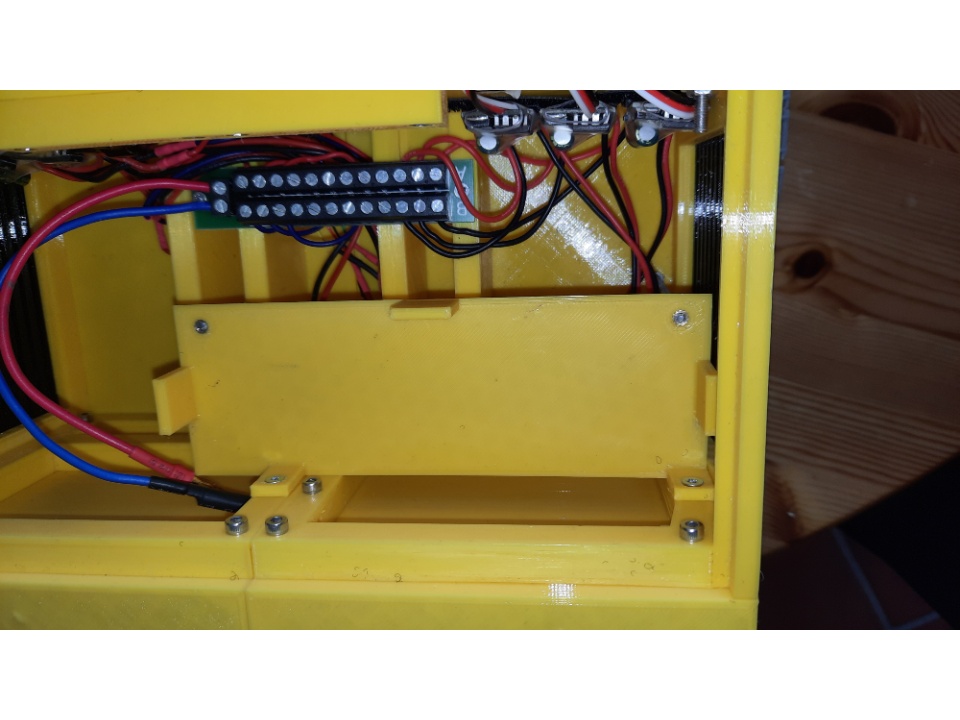 Motorseitig wurde der Schalter in der Getriebehalterung palziert und die Diode in Längsrichtung Motor. Stosstangenseitig wurde die Diode auf die Rückseite des Schalter gelötet und in eine separate Halterung eingebaut und dafür der Abschlussdeckel auf 0.5mm reduziert.