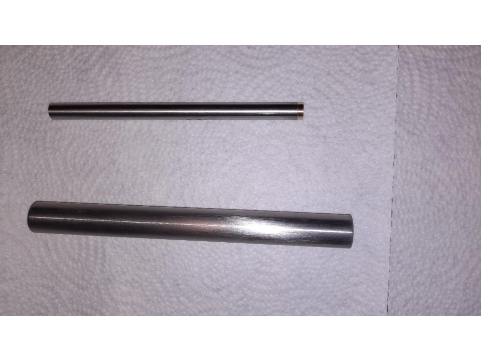 Edelstahlrohr DA 19mm, Wandstärke 0.5mm. Das Rohr bildet den Zylinder und wird auf die gewünschte Länge gekürzt Bild 10. Mit Hilfe der Bohrschablone werden die Notwendigen Löcher gebohrt. Für die Lizenführung wird jeweils ein Schlitz heraus getrennt Bild 9. Den Zylinderkörper habe ich schwarz eingefärbt.